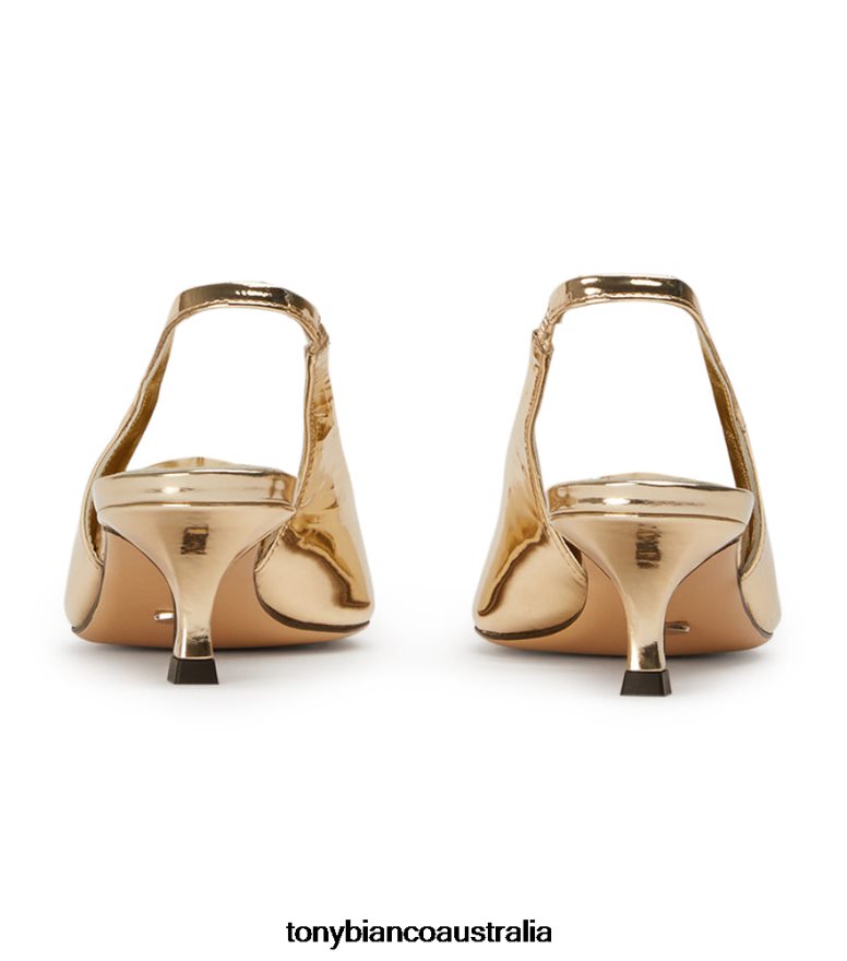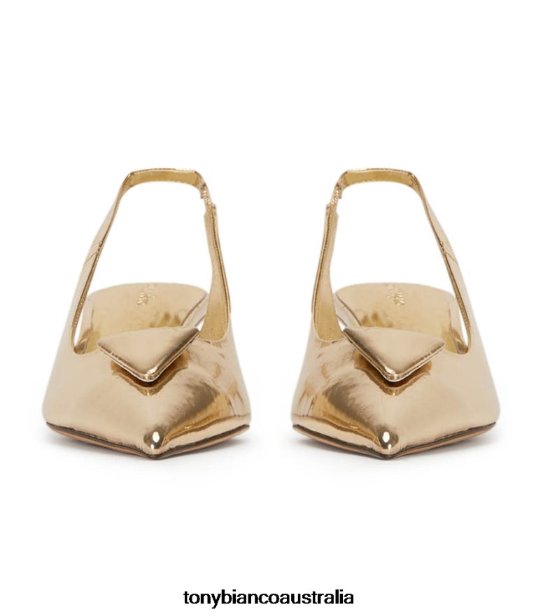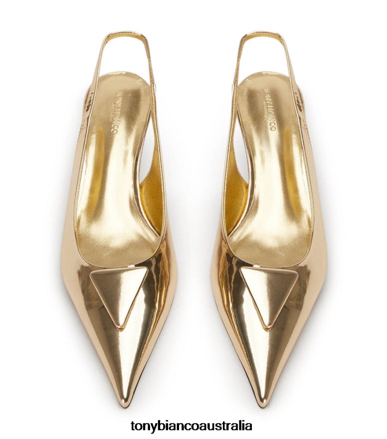 Radiating vintage charm this super low sling-back heel features a sleek, elongated pointed-toe and triangular plaque detailing. Kimmy's pared back and minimalistic design creates a classic silhouette. Made with our signature gold shine for ultimate style and sophistication.