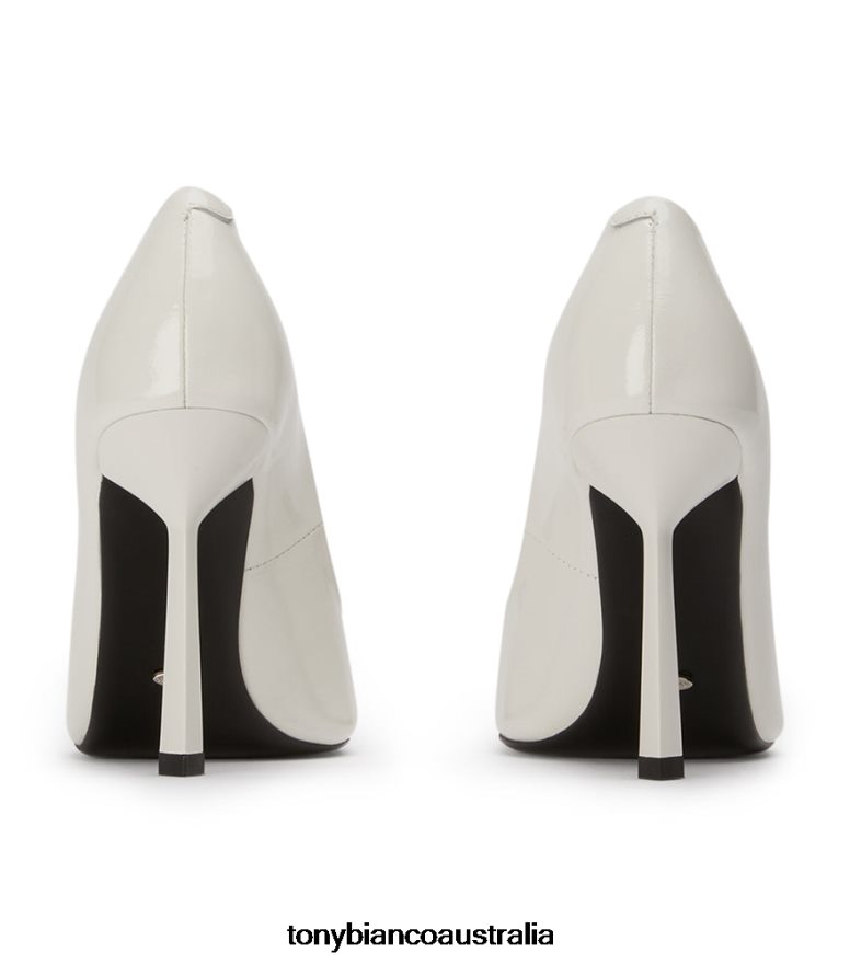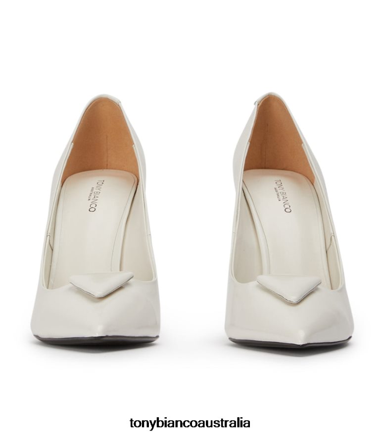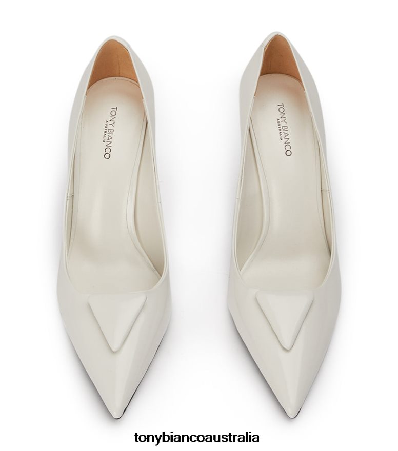 Gema captures contemporary sophistication and the elegance of a classic pump. Featuring an angular stiletto heel, sleek pared back design and triangular plaque detailing. This pointed court is crafted with our signature white hi shine leather for a refined and timeless look.