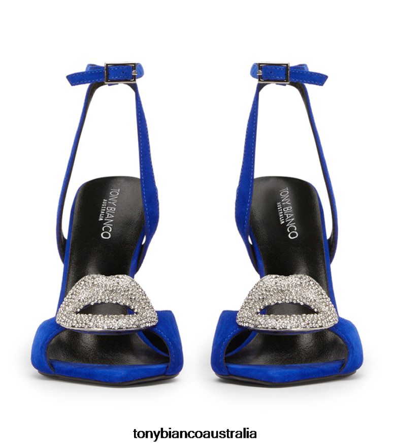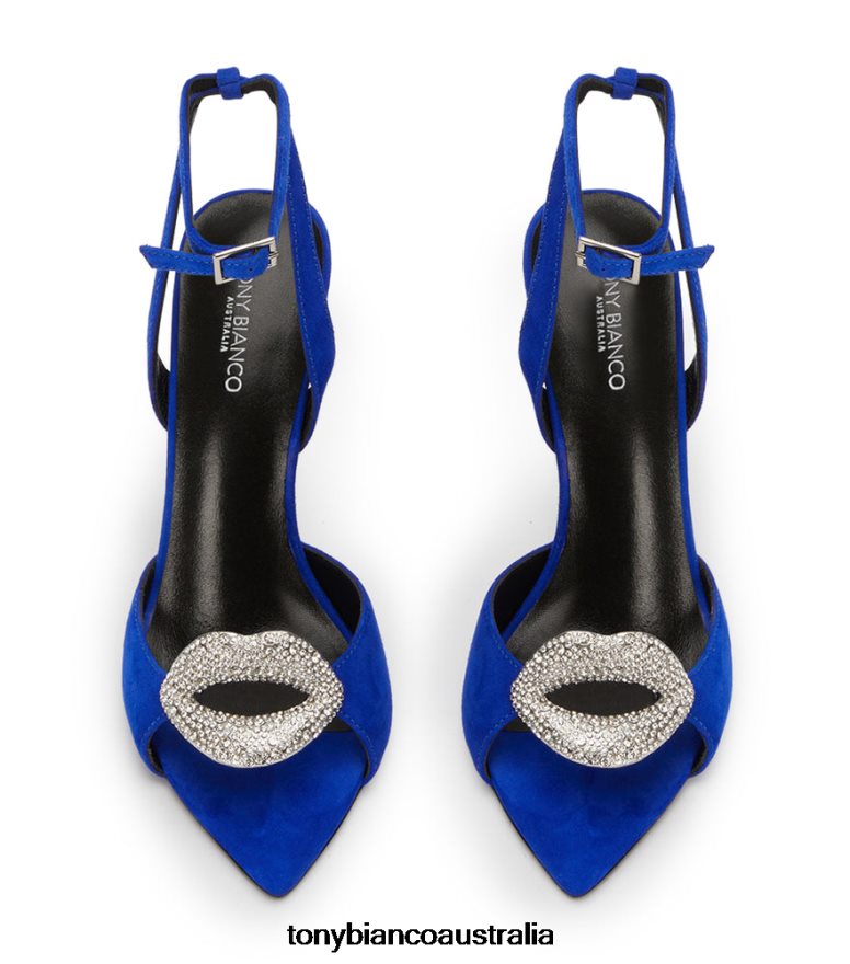 Level up the glam with Moshi, a sleek stiletto heel destined to turn heads. Featuring a pair of decorative diamante lips, a pointed toe, slender buckle ankle strap and finished in a vibrant blue suede, this style is hard to miss.