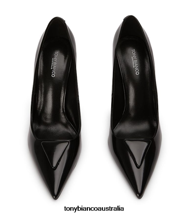 Gema captures contemporary sophistication and the elegance of a classic pump. Featuring an angular stiletto heel, sleek pared back design and triangular plaque detailing. This pointed court is crafted with our signature black hi shine leather for a refined and timeless look.