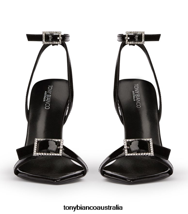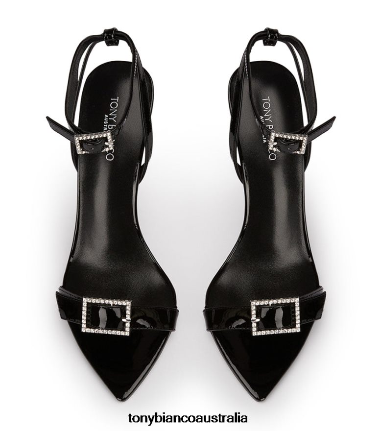 The perfect stiletto heel is here. Meet Mopsy, a sleek black patent heel featuring a pointed toe design, and a slender ankle strap. Finished with a decorative diamante buckle to the front and ankle.