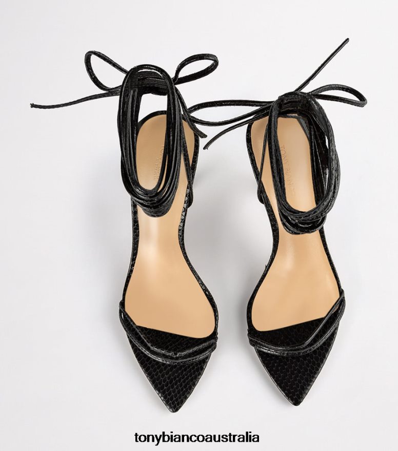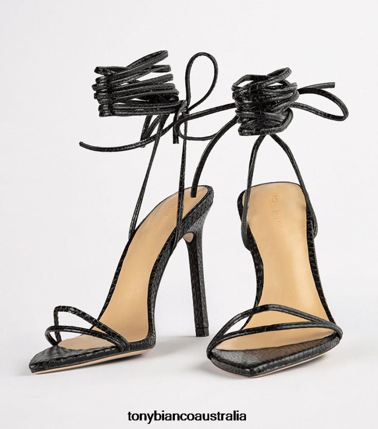 Set yourself up for some vibes with our Millie lace-up strappy heels in black aztec snake. Showcasing slender straps across the foot and a wrap-around ankle design, this style features a pointed toe-shape and a thin stiletto heel and is finished with a leather upper and quality leather lining.