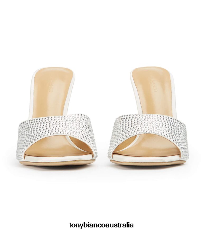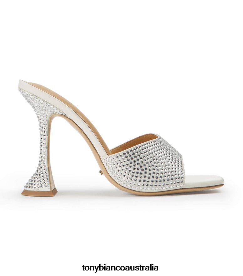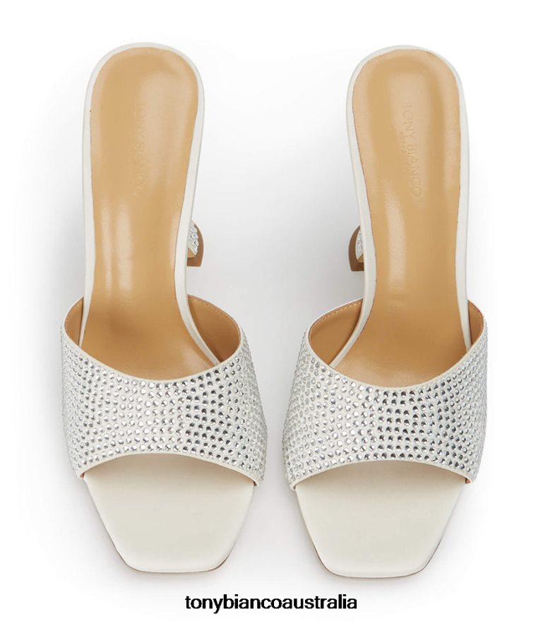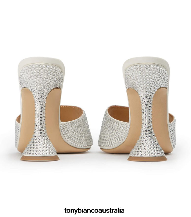 Slip on the Serri ivory mules and make a statement this season. Showcasing a lux hourglass stiletto heel, cushioned sole and embellishments from head-to-toe, these striking bling heels are ready to steal the spotlight.