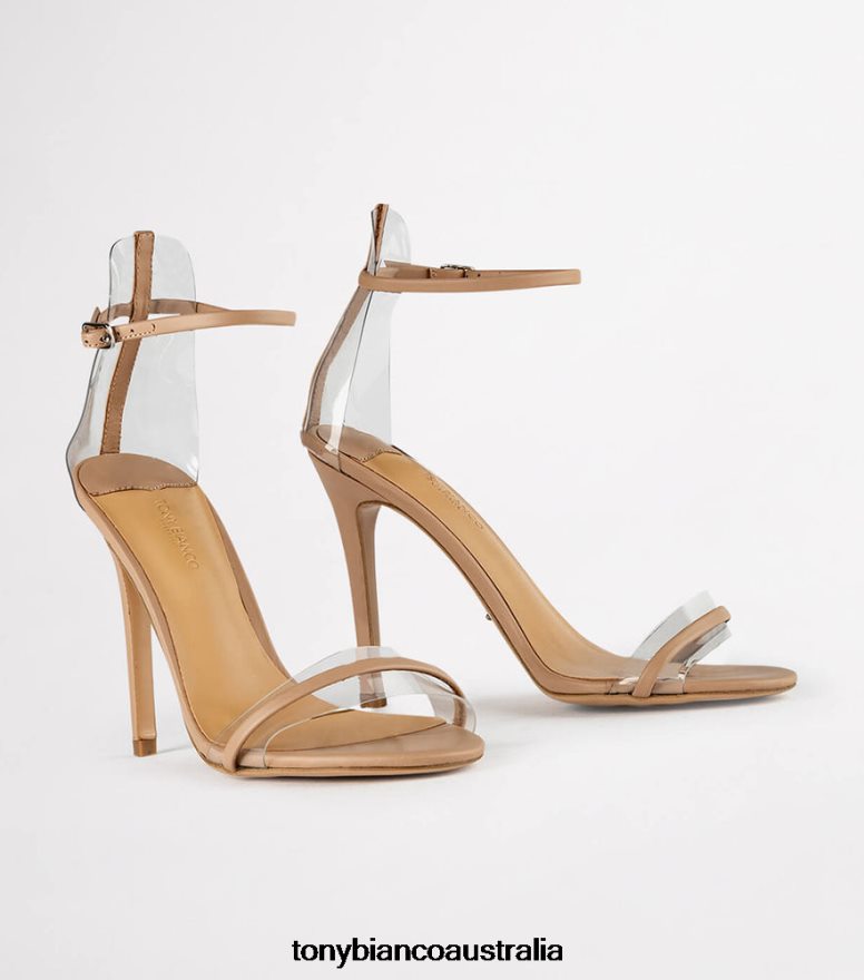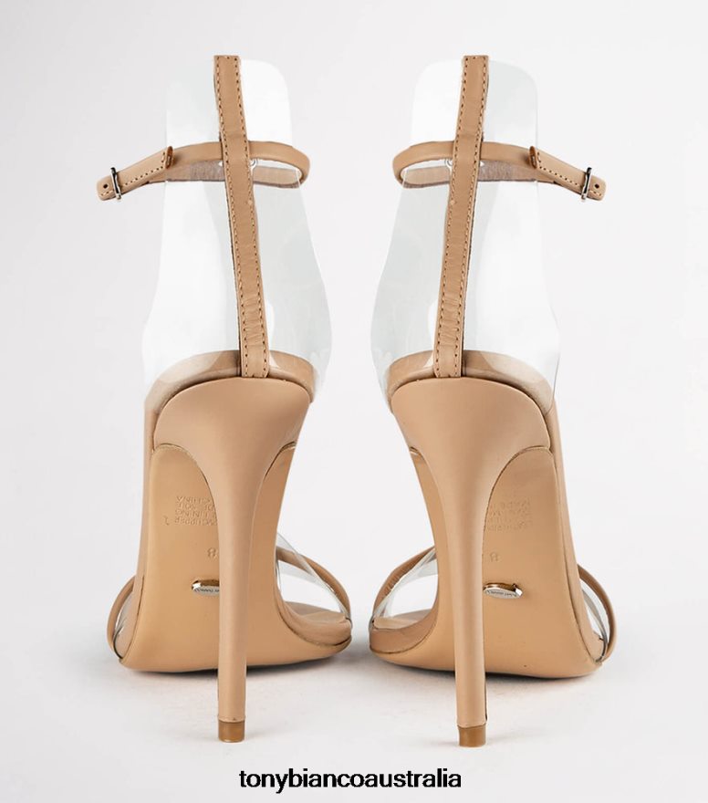 A skin leather open toe dress sandal with a stiletto heel with a leather and clear two strap upper.