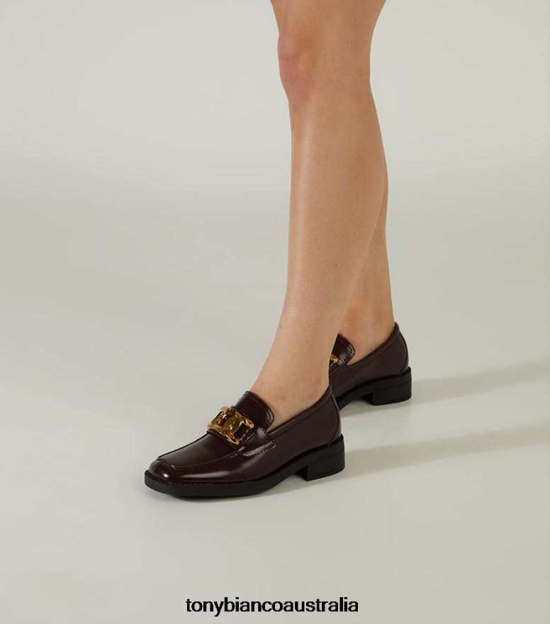 Looking for a loafer with that little bit more Look no further than Tia. Finished in a deep vino hi shine leather and featuring a chunky gold chain, she's hard to miss. With a small 4cm heel and super sleek square toe, this style will have everyone looking.